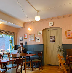 nieuwe en tweedehands boeken, koffie en thee, met lekkers, wenskaarten en kleine planten